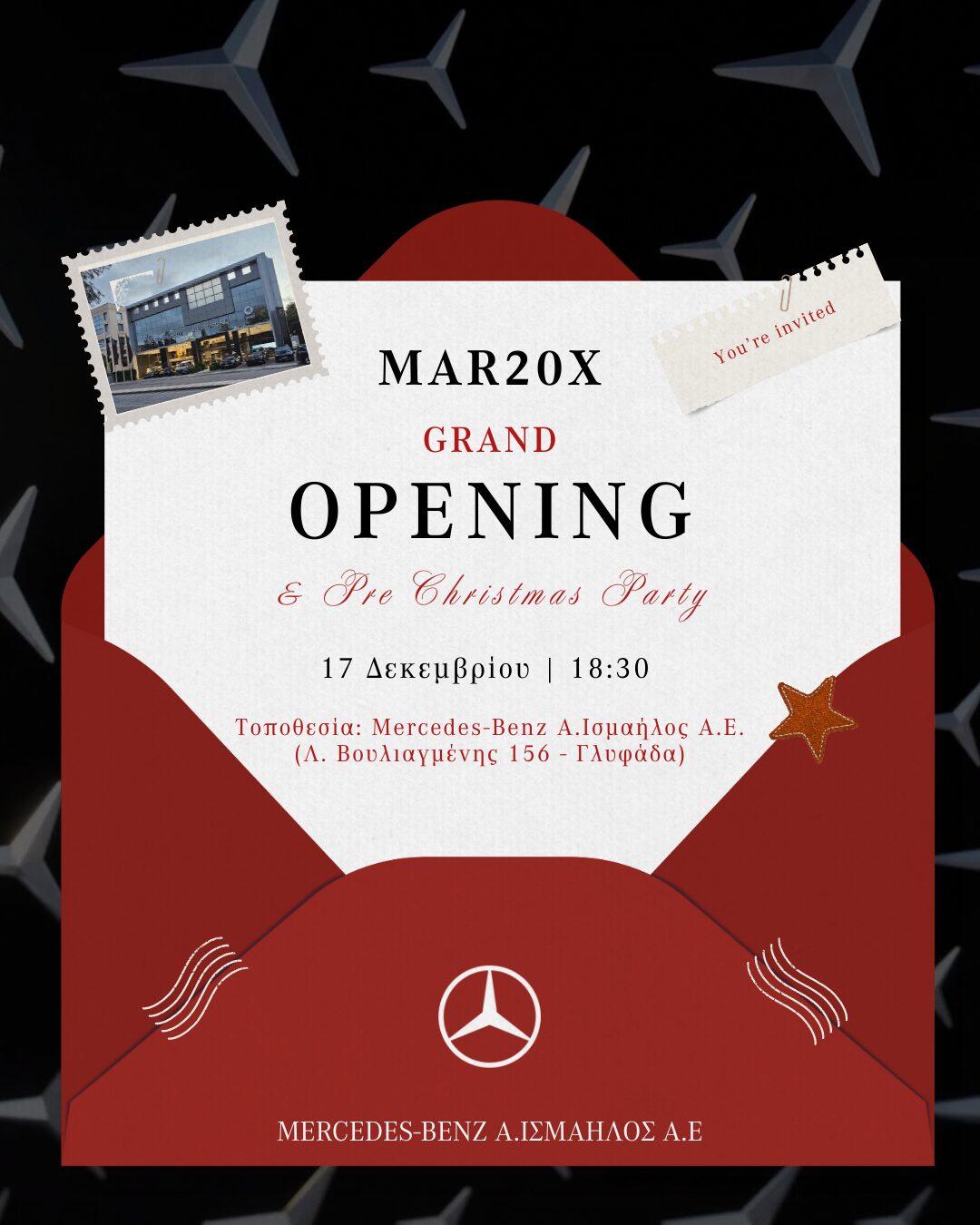 Στις 17 Δεκεμβρίου 2025, στις 18:30, σας υποδεχόμαστε στη Γλυφάδα για τα επίσημα εγκαίνια του νέου MAR20x Showroom της Mercedes-Benz Α. Ισμαήλος Α.Ε , σε μια βραδιά που συνδυάζει καινοτομία, κομψότητα και τη μαγεία των Χριστουγέννων. Ανακαλύψτε από κοντά τη νέα φιλοσοφία λιανικής της Mercedes-Benz, ζήστε μια μοναδική εμπειρία με εντυπωσιακά εκθεσιακά displays και απολαύστε το Pre-Christmas party μας, με ξεχωριστές εκπλήξεις και ένα ζεστό, γιορτινό atmosphere. Μια βραδιά αφιερωμένη στο μέλλον της premium αυτοκίνησης—και σε εσάς.
