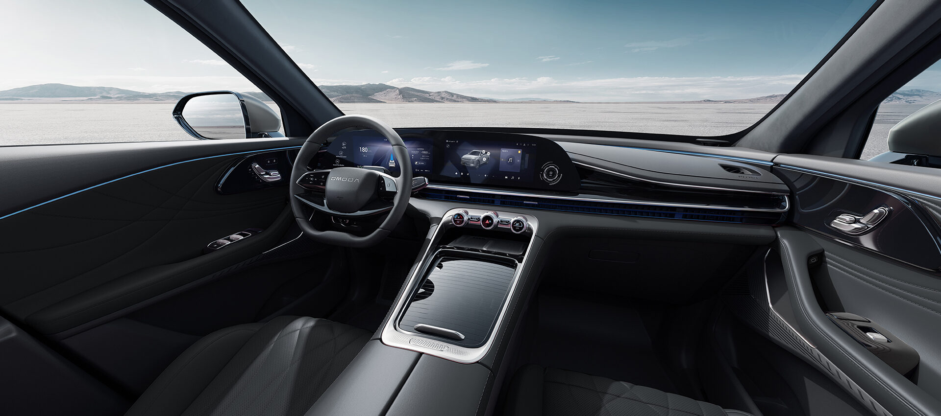 Το εσωτερικό του OMODA 9 επαναπροσδιορίζει την έννοια της σύγχρονης πολυτέλειας, συνδυάζοντας κορυφαία ποιότητα υλικών με τεχνολογία αιχμής. Η πανοραμική ψηφιακή διάταξη οθονών υψηλής ανάλυσης δημιουργεί ένα προηγμένο cockpit που προσφέρει άμεση πληροφόρηση και απόλυτο έλεγχο στον οδηγό. Ο ατμοσφαιρικός φωτισμός πολλαπλών επιλογών, τα premium καθίσματα με ηλεκτρικές ρυθμίσεις, θέρμανση και αερισμό, καθώς και τα προηγμένα συστήματα άνεσης, διαμορφώνουν ένα περιβάλλον υψηλών προδιαγραφών.